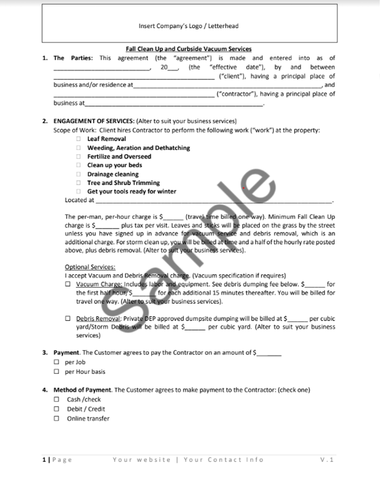 Create customized fall clean-up and services agreements that suit your business services. Print or download your contract for free. Quick and easy. Don't forget to customize it by adding your details and information where it is required. Disclaimer: The information provided by us is for general informational purposes only. All information on the site and mobile application is provided in good faith, however we make no representation or warranty of any kind, express or implied, regarding the accuracy, adequacy, validity, reliability, availability, or completeness of any information on the Site or our mobile application. The legal information is provided for general informational and educational purposes only and is not a substitute for professional advice. Accordingly, before taking any actions based upon such information, we encourage you to consult with the appropriate professionals. Download Download